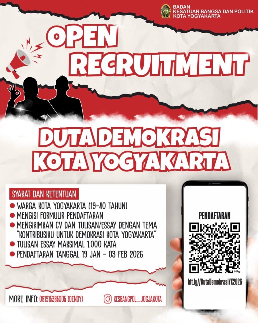RILISINFO.COM, YOGYAKARTA – Badan Kesatuan Bangsa dan Politik (Bakesbangpol) Kota Yogyakarta menggelar Pemilihan Duta Demokrasi Tahun 2026 dengan tujuan mengangkat peran generasi muda sebagai garda terdepan dalam memperkuat tatanan demokrasi di daerah. Program ini dirancang untuk meningkatkan partisipasi politik pemuda, yang hingga kini masih belum optimal meskipun jumlahnya cukup signifikan.