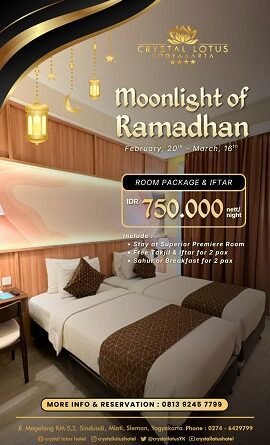 Paket menginap ini berlaku mulai (20/2/26 — 16/3/26) dan ditawarkan dengan harga IDR 750.000 nett per malam. Melalui promo ini, Crystal Lotus Hotel menghadirkan konsep staycation bernuansa Ramadhan yang hangat dan menenangkan di tengah Kota Yogyakarta.