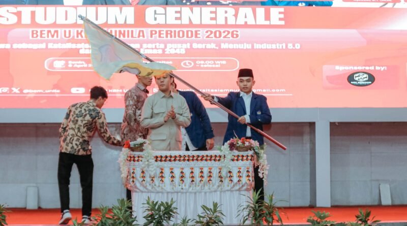RILISINFO.COM, BANDARLAMPUNG – Gubernur Lampung Rahmat Mirzani Djausal menghadiri Acara Stadium General dan Pelantikan Pengurus BEM U KBM Universitas Lampung (Unila) periode 2026 yang digelar di Gedung Serbaguna (GSG) Unila, Senin (6/4/2026). Acara ini turut dihadiri oleh Ketua Komisi III DPR RI, Dr. Habiburokhman, S.H., M.H., serta jajaran Forum Komunikasi Pimpinan Daerah (Forkopimda).