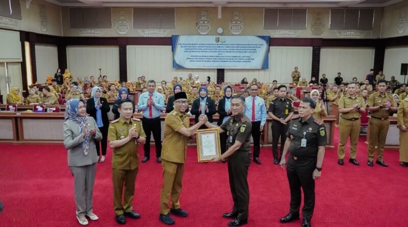 RILISINFO.COM, BANDAR LAMPUNG — Gubernur Lampung Rahmat Mirzani Djausal menerima penyerahan Berita Acara Kesepakatan Bersama atas Tindakan Hukum Lain dari Jaksa Pengacara Negara (JPN) Kejaksaan Tinggi Lampung terkait pemulihan aset milik Pemerintah Provinsi Lampung di Pangkalan Pendaratan Ikan (PPI) Kalianda, Muara Piluk, dan Ketapang. Acara tersebut berlangsung di Gedung Pusiban, Kantor Gubernur Lampung, Selasa (30/9/2025).