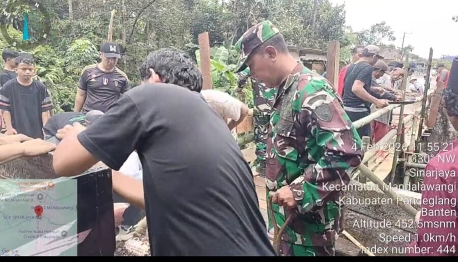 RILISINFO.COM, Pandeglang – Kegiatan Karyabakti Danramil 0105 Mandalawangi bersama kepala desa dan warga masyarakat melaksanakan kegiatan gotong royong pembuatan jembatan darurat yang berada di Kampung Kadu Pandak, Desa Sinarjaya, Kecamatan Mandalawangi, Kabupaten Pandeglang-Banten pada hari Rabu (04/02/2026).
