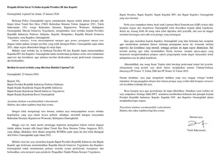 Totok Suhermanto memilih jalur surat terbuka, menyasar Presiden RI Prabowo Subianto hingga pucuk pimpinan Polri.