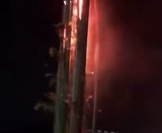 Dalam video yang beredar, terlihat kobaran api cukup besar menjalar di sepanjang tiang listrik.