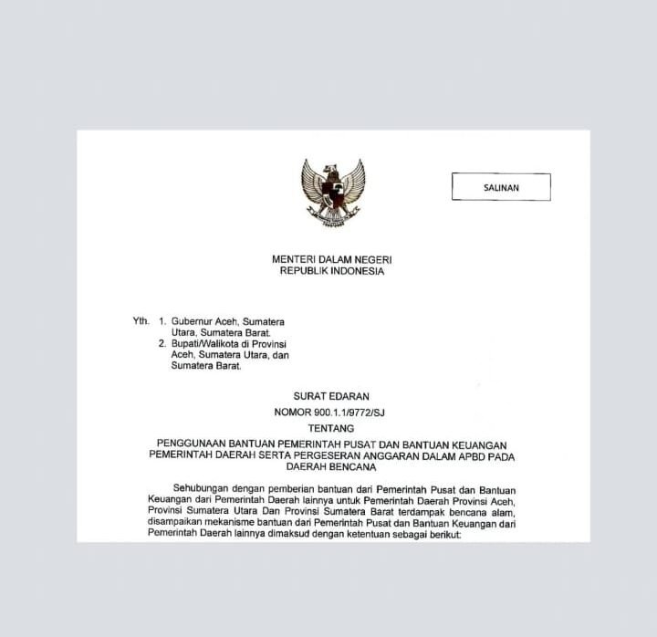 RILISINFO.COM, Jakarta – Menteri Dalam Negeri (Mendagri) Muhammad Tito Karnavian menerbitkan Surat Edaran (SE) Nomor 900.1.1/9772/SJ tentang Penggunaan Bantuan Pemerintah Pusat dan Bantuan Keuangan Pemerintah Daerah (Pemda) serta Pergeseran Anggaran dalam APBD Daerah Bencana. Surat yang ditujukan kepada kepala daerah di Aceh, Sumatera Utara (Sumut), dan Sumatera Barat (Sumbar) tersebut diteken Mendagri pada Kamis, 11 Desember 2025.