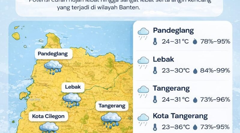 “Memasuki siang hari, cuaca diprakirakan berawan hingga hujan ringan, dengan potensi hujan sedang di wilayah **Cipanas, Muncang, Sajira, Maja, Rangkasbitung, Cikulur, Cibeber, Sobang, Curug Bitung, Pandeglang, Cadasari, Karang Tanjung, Koroncong, Majasari, Waringinkurung, Petir, Baros, Ciomas, Pabuaran, Padarincang, Anyar, Cinangka, Mancak, Gunung Sari, Cilegon, Serang, Cisoka, Balaraja, Tigaraksa, Panongan, Jambe, Curug, Pagedangan, Cisauk, Tangerang, Ciputat, dan Serpong,” jelas Meryadi.