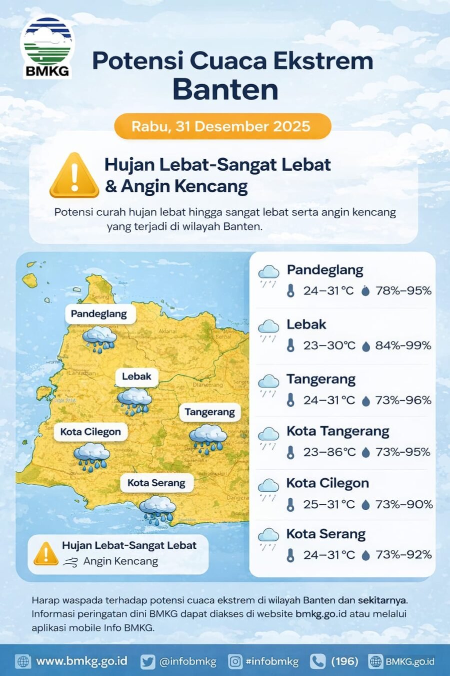 RILISINFO.COM, Serang – Menyikapi prakiraan cuaca dari Badan Meteorologi, Klimatologi, dan Geofisika (BMKG) Banten, Polda Banten mengimbau masyarakat untuk meningkatkan kewaspadaan terhadap potensi cuaca ekstrem yang berpeluang terjadi di sejumlah wilayah Provinsi Banten pada Rabu (31/12/2025).