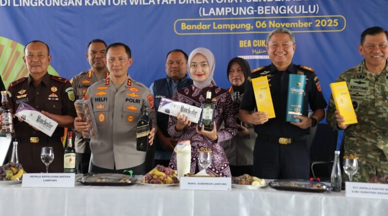 RILISINFO.COM, Bandar Lampung — Pemerintah Provinsi Lampung bersama Kantor Wilayah Direktorat Jenderal Bea dan Cukai (DJBC) Sumatera Bagian Barat (Sumbagbar) melaksanakan pemusnahan barang hasil penindakan terhadap 29,18 juta batang rokok ilegal, 53,5 kilogram tembakau iris, serta 13,4 ribu liter minuman mengandung etil alkohol (MMEA), di Bandar Lampung, Kamis (6/11/2025).