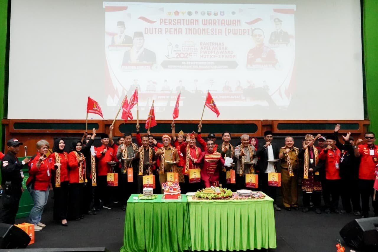 RILISINFO.COM, Bandar Lampung – Gubernur Lampung yang diwakili Kepala Dinas Komunikasi, Informatika, dan Statistik Provinsi Lampung, Ganjar Jationo, menghadiri Rapat Kerja Nasional dan Apel Akbar Persatuan Wartawan Duta Pena Indonesia (PWDPI) dalam rangka memperingati HUT ke-3 organisasi tersebut. Acara berlangsung di Gedung Graha Bintang, Universitas Malahayati Lampung, Senin (22/9/2025).