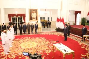 RILISINFO.COM, Jakarta – Menteri Dalam Negeri (Mendagri) Muhammad Tito Karnavian mendampingi Presiden Prabowo Subianto melantik Gubernur dan Wakil Gubernur Kepulauan Bangka Belitung (Babel) Hidayat Arsani dan Hellyana, serta Gubernur dan Wakil Gubernur Papua Pegunungan John Tabo dan Ones Pahabol. Pelantikan berlangsung di Istana Negara, Jakarta, Kamis (17/4/2025).