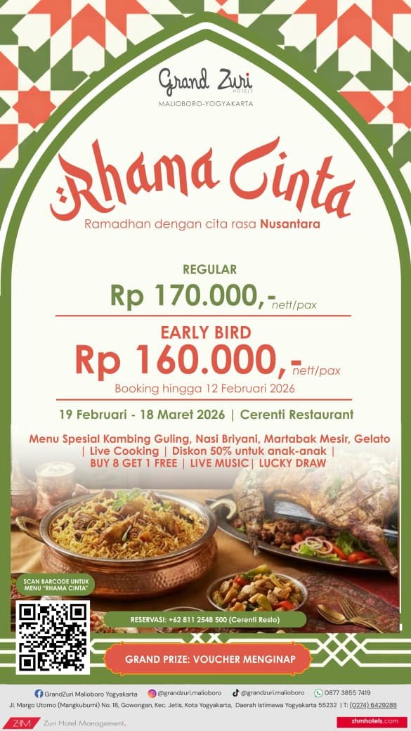 Untuk menikmati Paket Rhama Cinta, Grand Zuri Malioboro Yogyakarta menawarkan harga Rp170.000 nett per orang untuk dewasa, Rp80.000 nett per orang untuk anak usia 6–11 tahun, serta gratis bagi anak usia 1–5 tahun. Tersedia pula promo Early Bird seharga Rp160.000 nett per orang hingga 21 Februari 2026, serta penawaran menarik Buy 8 Get 1 Free. Suasana buka puasa semakin hangat dengan penampilan live music setiap hari dan kesempatan memenangkan Grand Prize berupa voucher menginap.