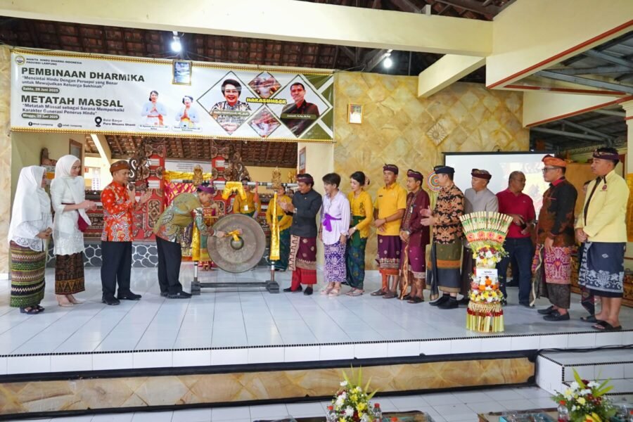 Pembukaan Pembinaan Dharmika dan Меtаtah Massal secara resmi ditandai dengan pemukulan gong oleh Sekretaris Daerah Provinsi Lampung, Marindo Kurniawan.