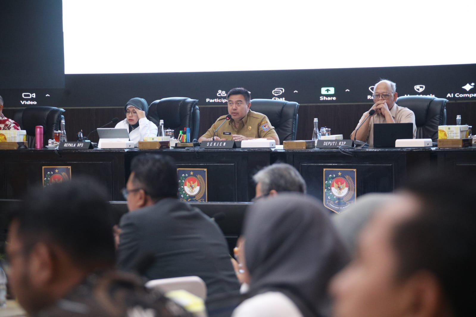 Selain Kepala BPS, turut hadir langsung dalam rapat tersebut sejumlah narasumber lainnya, di antaranya Pelaksana Tugas (Plt.) Deputi II Bidang Perekonomian dan Pangan Kantor Staf Presiden (KSP) Edy Priyono, Direktur Jenderal (Dirjen) Perumahan Perdesaan Kementerian Perumahan dan Kawasan Permukiman (PKP) Imran, serta Direktur Pengawasan Penerapan Standar Keamanan dan Mutu Pangan Badan Pangan Nasional (Bapanas) Hermawan. Hadir pula secara virtual pembicara dari kementerian dan lembaga lainnya. Selain itu, turut bergabung jajaran Pemda dan Forum Koordinasi Pimpinan Daerah (Forkopimda).(Nad)
